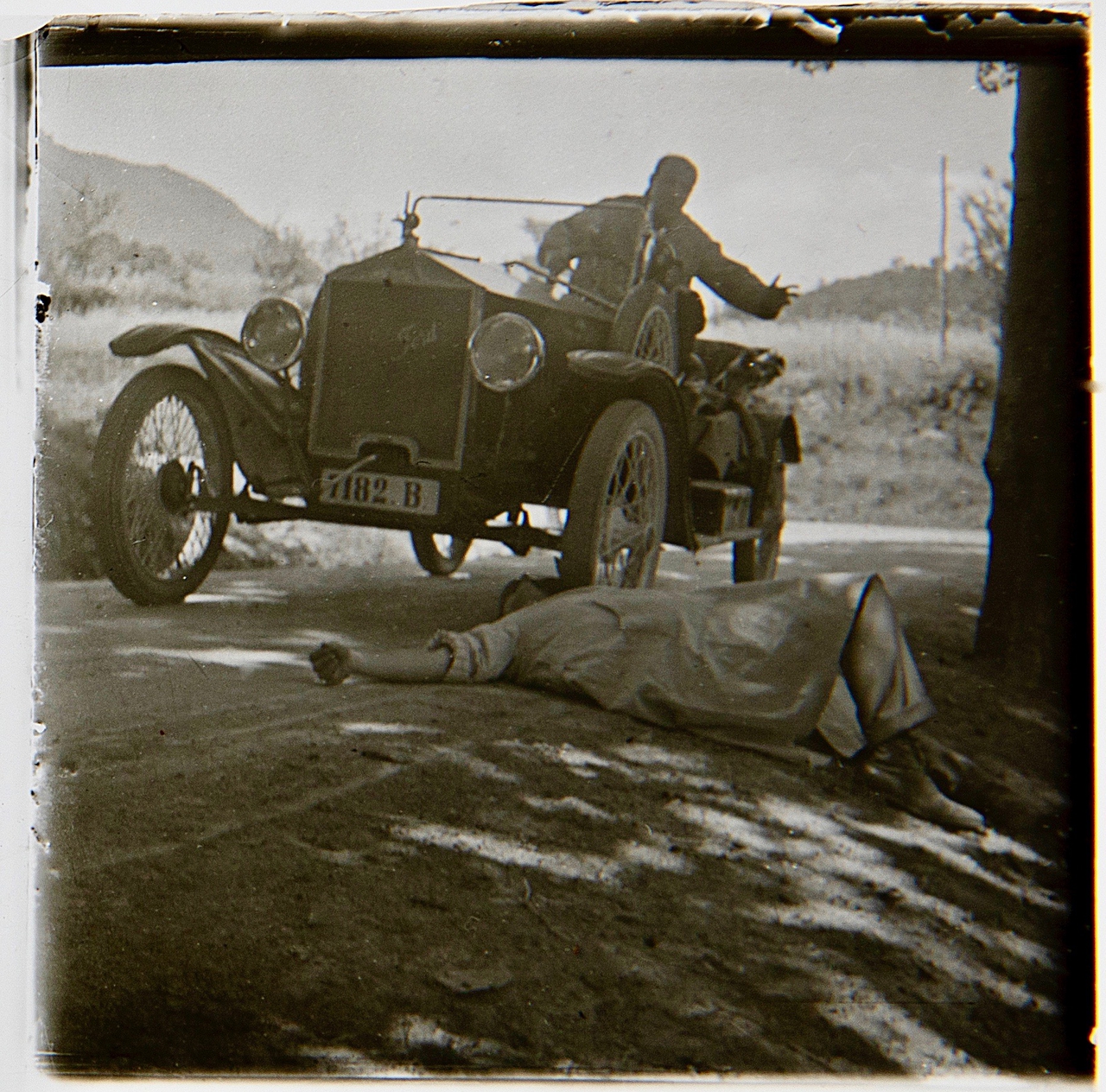 I en una altra fotografia, aquesta estereoscòpica, escenifica el dolor de la modernitat: una persona atropellada per un automòbil. Quan s’observa la imatge en tres dimensions, el coll de l’atropellat s’enfonsa en el pneumàtic del cotxe.