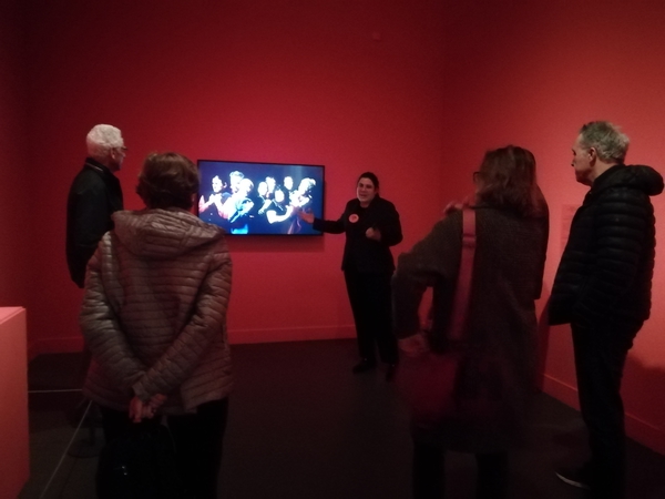 On one screen there is a singer performing a traditional Sufi song before a male audience. When the singer finishes attention is directed to another screen on which a woman dressed in black, the singer Sussan Deyhim gives an incredible performance in an empty auditorium. This is a protest against the situation of women in Iran, where they are not allowed to sing in public or record their performances, explains the guide of the microvisit. The silence of the group is moving. The emotion of the magnificent piece performed by Neshat has undoubtedly touched the group, which probably joined the visit spontaneously.