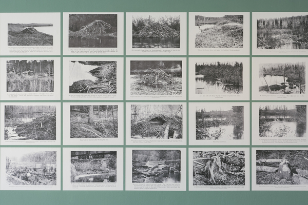 És estranya l’exposició que Òscar Holloway (Barcelona, 1989) presenta a l’antiga nau tèxtil de Can Felipa, al Poblenou. Fa uns cinc anys que documenta llibres, fotografies i altres materials dels grans noms del camera hunting, sobretot de finals del segle XIX i les primeres dècades del segle XX. Holloway ens presenta imatges de noms tan coneguts com Eadweard Muybridge, Arthur Radclyffe Dugmore o Georges Shiras III. Tanmateix, quan es porta una estona observant les fotografies en una disposició a l’espai subtil i exquisida, una es pregunta: on són els animals? I és que, dels boscos, prats, rius i llacs capturats per la càmera d’aquests pioners del naturalisme, no ens arriba cap mirada. Tot i que de vegades hi observem una ombra o un remolí a l’aigua que denota una presència física, no la veiem enlloc. A Captures: The Shooting of the Future, –aquest és el títol de l’exposició– i en un treball minuciós d’edició d’imatge, Holloway ha suprimit tota presència animal.