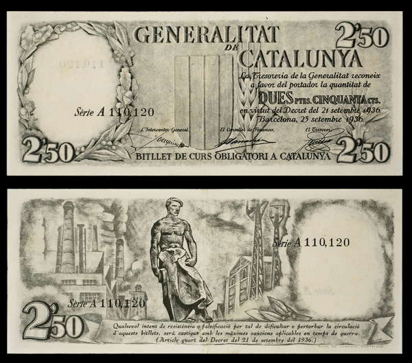 L’únic artista català que, literalment, va imprimir diners, va ser Josep Obiols. El 1936, poc després de començar la guerra civil, per encàrrec de la Generalitat, va dissenyar i es van imprimir bitllets de 2,5, 5 i 10 pessetes.