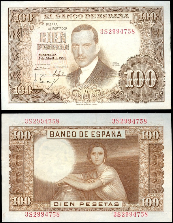El estado español, en cambio, ha impreso numerosas veces billetes de banco dedicados a pintores: Goya, Sorolla, Zuloaga, Santiago Rusiñol –el catalán que venía duros a cuatro pesetas–, Rosales o Julio Romero de Torres: su billete de 100 pesetas marrón estuvo en circulación entre 1953 y 1978, reproduciendo una obra, La Fuensanta, que nadie supo donde paraba hasta 2007. Se llegaron a imprimir 981.200.000 ejemplares.