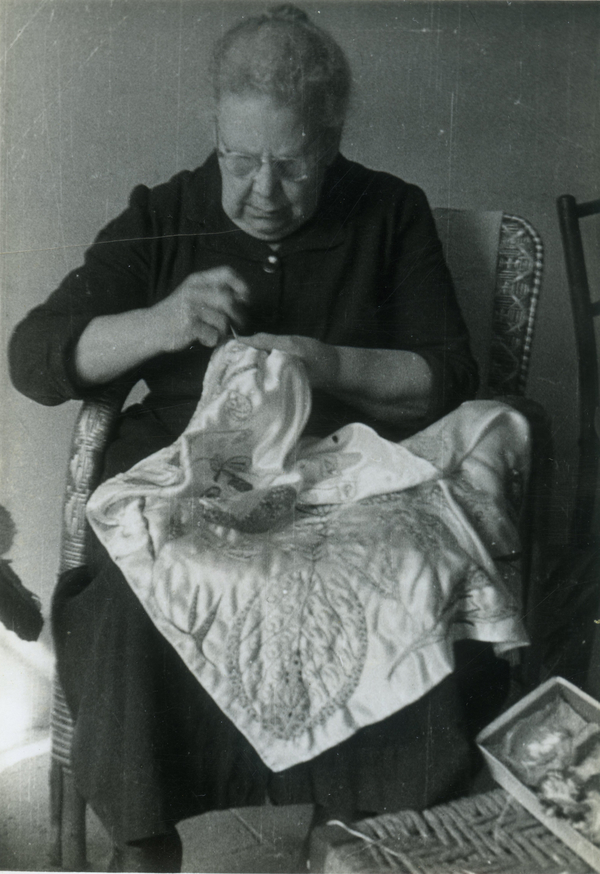 Josefa Tolrà brodant mantells de seda a la casa de Cabrils, any 1956. ® Associació Josefa Tolrà.