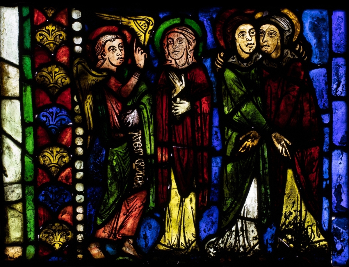 Hasta aquí los elementos que parecen comprensibles —del cromatismo de los vitrales hablaremos también más tarde—. Lo que ya no lo es tanto es la fisonomía de las caras, el dibujo de los ojos. No se comprenden. Son unas caras y unos ojos que se parecen mucho, demasiado, a las que tradicionalmente habían sido atribuidas a un desconocido Maestro del Presbiterio. Un maestro que según el gran erudito Joan Ainaud i de Lasarte habría comenzado su participación en la catedral hacia 1348. Un maestro que tiene rasgos específicos: “los ojos marcan los párpados con dos trazos en forma de pez reseguidos aún con uno o dos trazos más delgados paralelos a los primeros. Las cejas están ligeramente arqueadas, y una de ellas continúa, dibujando la nariz con una pincelada en forma de u para dibujar la nariz. La boca está hecha de una pincelada rotunda, en forma de eme abierta con dos rayitas paralelas encima y debajo, dibujando los labios. (…) Las manos, de dedos romos, marcan los pliegues con dos rayitas paralelas, y las uñas son en forma de u con una doble raya en la parte de abajo…” (Els vitralls de la catedral de Girona p. 56) Parece que esté describiendo la Natividad del siglo XIII descubierta a finales del año pasado y que Ainaud no conoció. ¿Cómo se explica que se parezca tanto esta Natividad a la mayoría de personajes de los vitrales del Presbiterio? ¿La figura de una santa de la vidriera Norte-III (a2) no es idéntica a nuestra Virgen? ¿Cómo es posible que la Natividad a la que está dedicado todo el ventanal Sur-III tenga tantas similitudes y al mismo tiempo discrepancias con la Natividad recién descubierta? ¿El Niño Jesús y la Virgen del vitral Sur-IV (Adoración de los Reyes) no son igualmente idénticos? Lo mismo podemos decir sobre la figura femenina (c2) del vitral Sur-V (La presentación en el templo) y otros personajes de la colección del Presbiterio. Quizá pueda ofrecer una respuesta a estas preguntas en el artículo de la semana próxima.