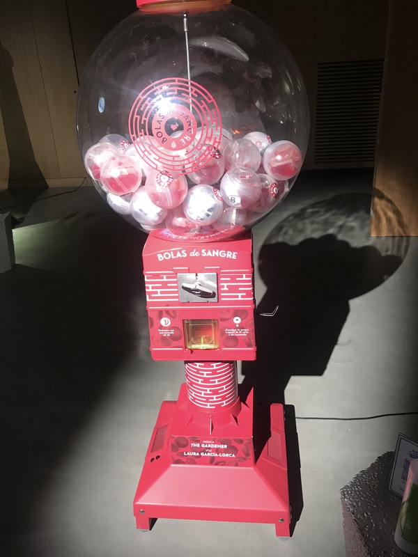 Las propuestas suenan mejor que su concreción. Cuatro están basadas en obras de teatro de Lorca: Bolas de sangre –un expendedor donde podemos comprar bolas con líquido rojo como la sangre–, La grúa de Bernarda Alba –una pequeña garra metálica nos ayuda a conseguir varios fetiches como el perfume de Pepe el Romano o un abanico firmado por las protagonistas de este drama–, Amor de don Perlimplín con Belisa en su futbolín –un futbolín tuneado–, y Yerma la nuit –un expendedor de preservativos alusivo a la infertilidad–. También hay una máquina para convertir billetes de cinco euros en monedas: Así que pasen 5 euros. Y dos máquinas de temática más genérica: un arcade matamarcianos donde Lorca dispara castañuelas al rostro de Dalí Cadaqués invaders, y una atracción de mamporros donde debemos dar en la cabeza de las creadoras y pensadoras de la generación del 27 silenciadas –unas más que otras–: Rosa Chacel, Maruja Mallo, etc.