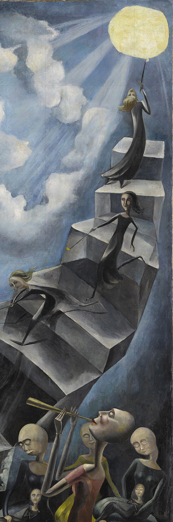 Aleshores, ella, es va passar dia i nit construint el món en el seu interior i el va anar deixant anar a poc a poc en dibuixos al carbó. El va imaginar quadrat, per influència del cubisme de Picasso, però el va omplir de dones que baixaven escales i d’altres que il·luminaven les estrelles com Deesses de l’Antiguitat. Corria l’any 1929 i el món real, no l’imaginari, portava vents que presagiaven la malvestat. Però ella ho desconeixia tot, refugiada en els llibres que li deixava el seu germà Rafael, com Realismo mágico de Franz Roh. I, de sobte, en aquella tela blanca hi va anar apareixent el seu món blau, oníric i màgic.