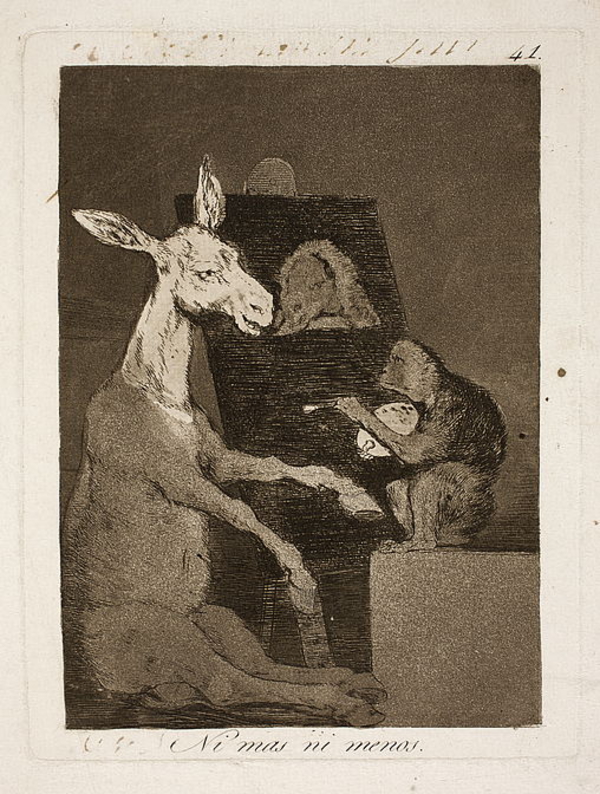 Mariano Fortuny (1838-1874) es, sin duda, nuestro mejor grabador. El marchante A. Goupil le apoyó en el uso de esta técnica, espoleado por el éxito abrumador de sus pinturas y esperando repetirlo con sus aguafuertes y aguatintas; obras donde el artista de Reus realizó muchas pruebas y experimentó de forma magistral abordando toda clase de temas: el oriental (Cabileño muerto, Árabe velando el cadáver de su amigo), tema de casacas (El botánico, Maestro de ceremonias), obras en clave barroca (como el riberesco Anacoreta) o vistas nocturnas resueltas con manchas como La Serenata.