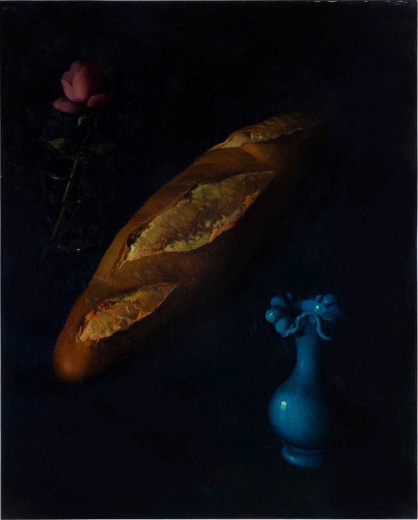 L’obra, dominada per un fons de blau potent, és molt semblant a una de les escenografies que el pintor bielorús va fer per al ballet Aleko, del coreògraf Léonide Massine, i en ella una parella vola dins de la nit blavíssima en una celebració de l’amor. El gall vermell, símbol d’esperança i fecunditat, beneeix la unió de la parella voladora, en un moment en el què Chagall acabava de perdre per una malaltia fulminant la seva primera esposa, Bella Rosenfeld.